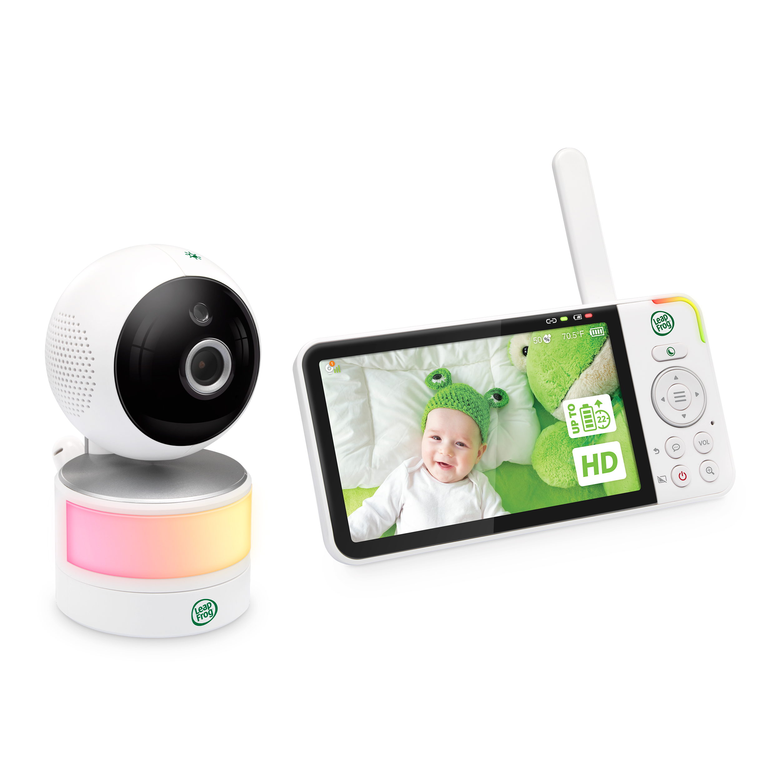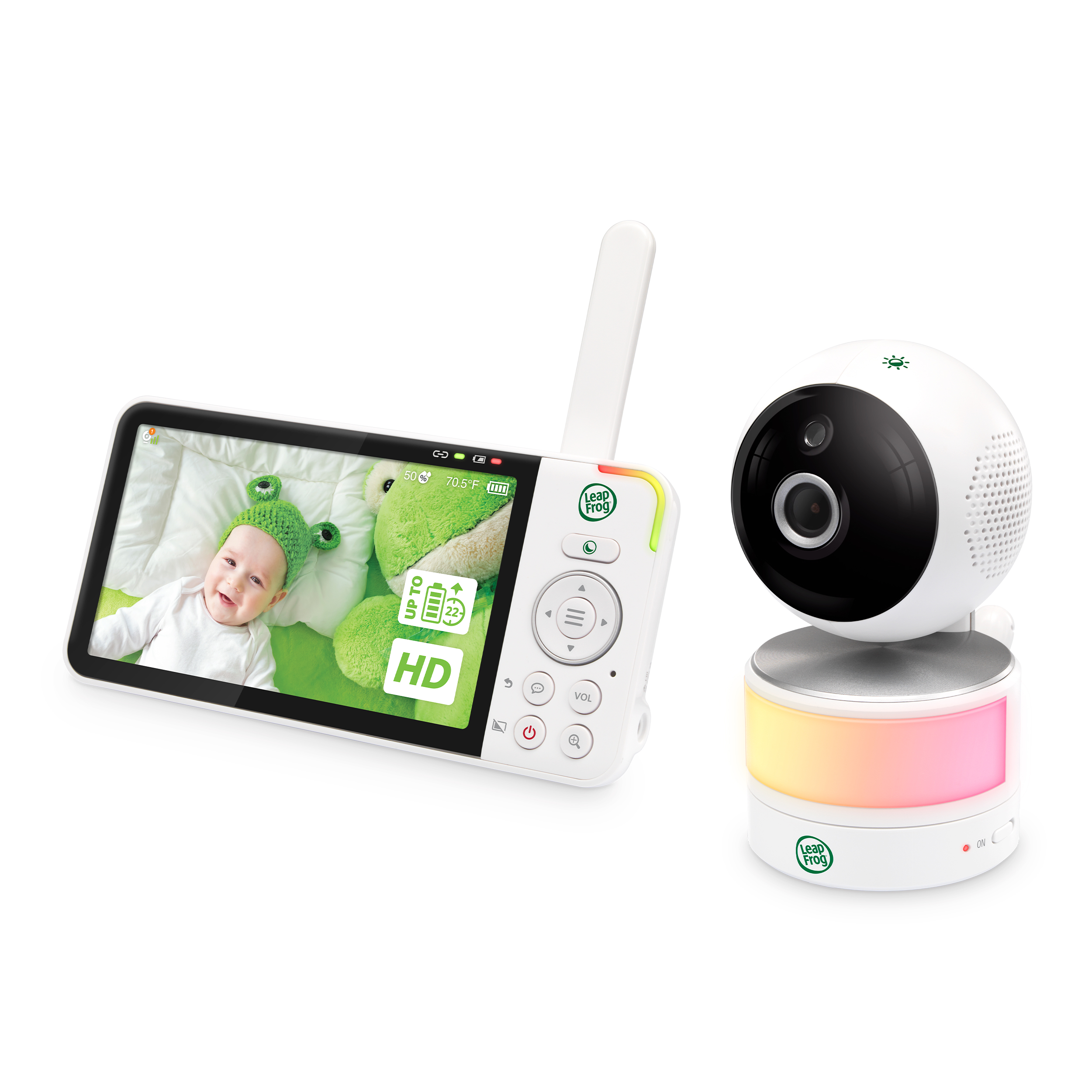 The built-in night light adjusts to the brightness of the room and is dimmable by one-touch, or by the parent unit.